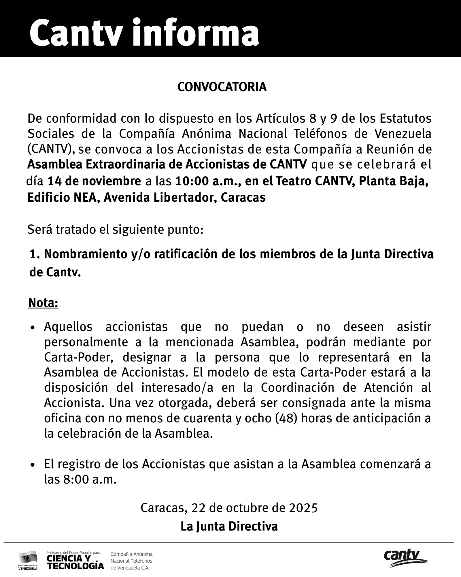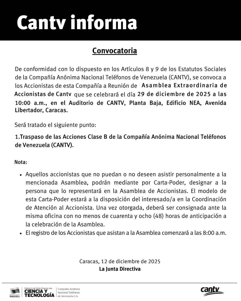 Publicación de Convocatoria a Asamblea Extraordinaria de Accionistas de la Compañía Anónima Nacional Teléfonos de Venezuela (CANTV).