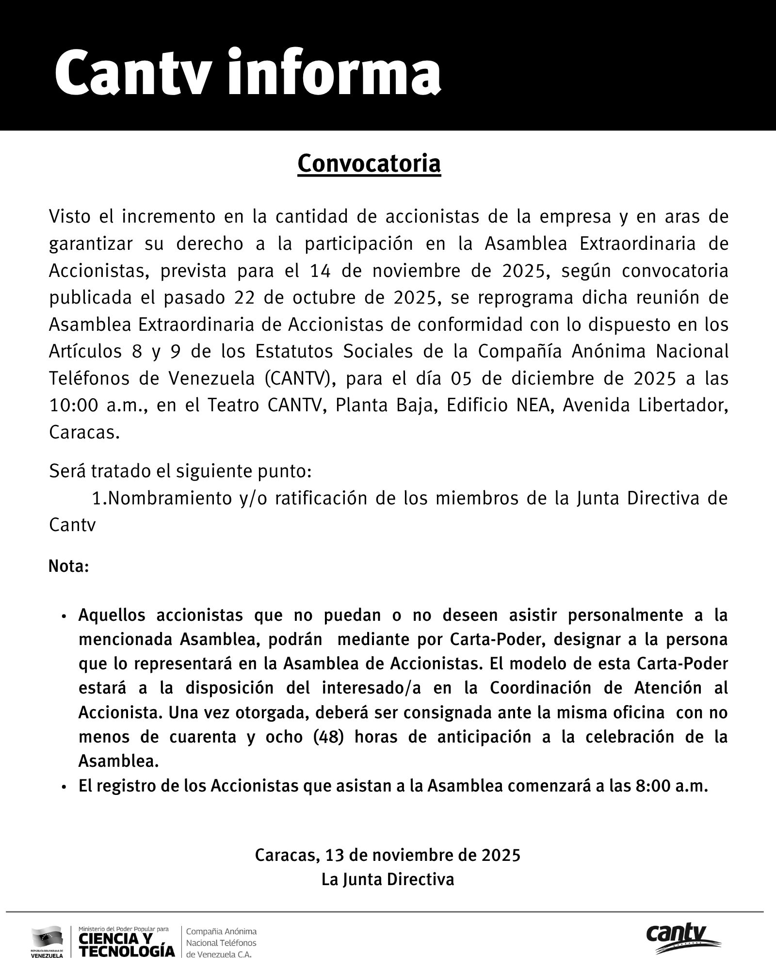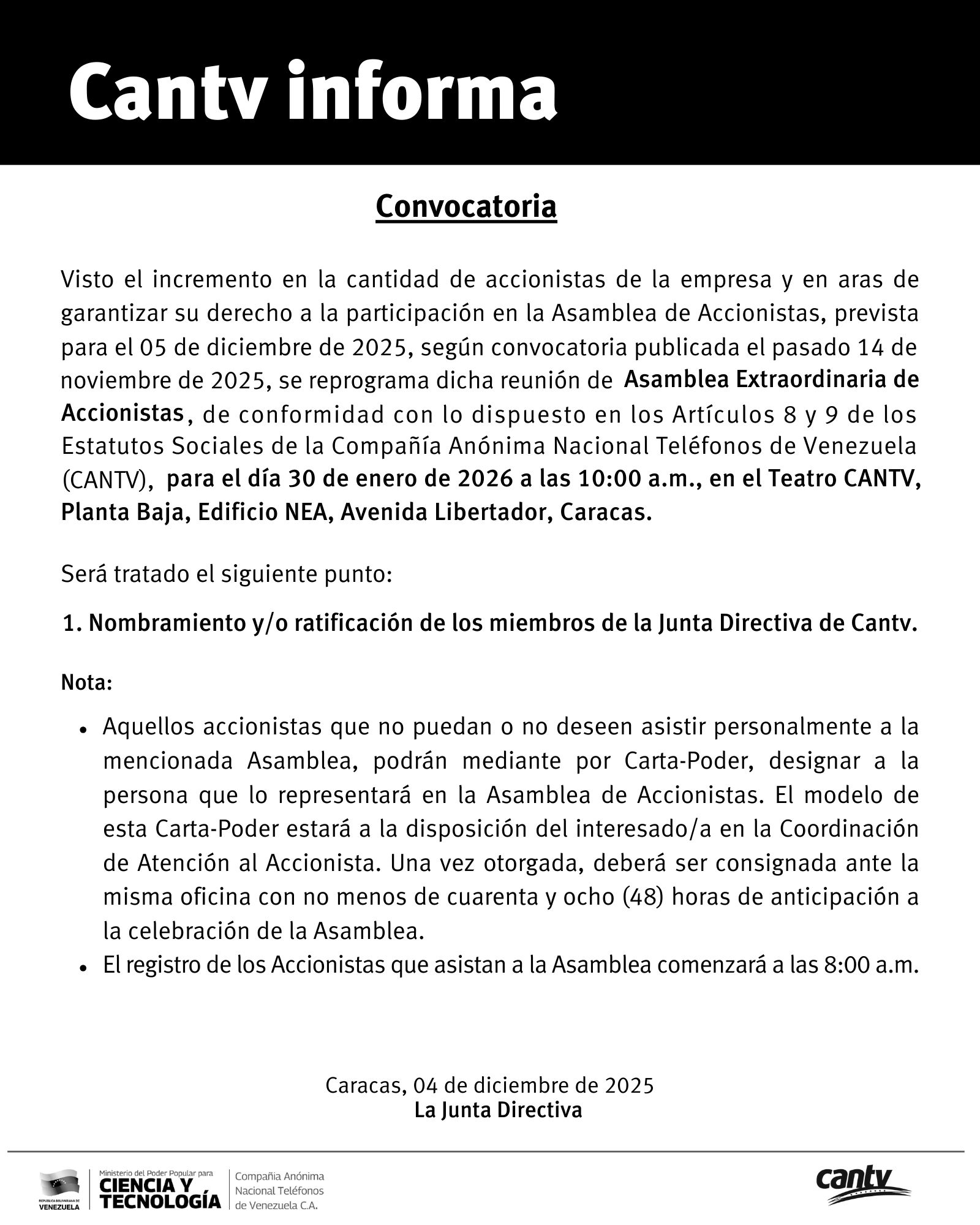 CONVOCATORIA ASAMBLEA EXTRAORDINARIA DE ACCIONISTAS DE CANTV (reprogramación).